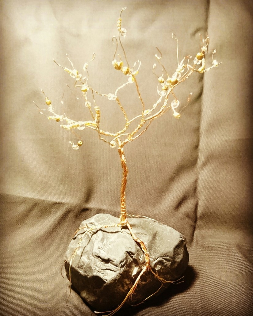 Step one: i wrapped gold and bronze wire around a box several times, slid it off then cut it to create many straight stands of wire. (next time I think I’d use more to create a thicker trunk)